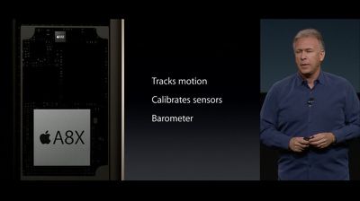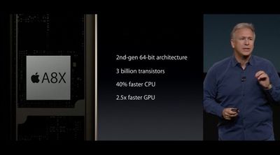 10:45: Чип A8X, 64-битная архитектура 2-го поколения, 3 миллиарда транзисторов, процессор на 40% быстрее, графический процессор в 2,5 раза быстрее.