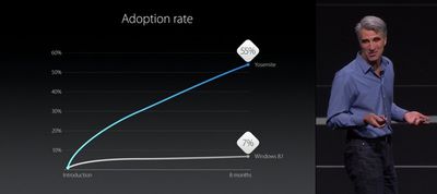 10:13 утра: Уровень внедрения невероятен: 55% активных пользователей Mac используют наше последнее обновление. 7% используют Windows 8.1. Самый быстрый уровень внедрения среди всех операционных систем для ПК.