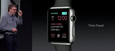 11:31 am: Текущая информация, а также прогноз погоды на сегодня. Что, если бы вы могли перемещаться во времени? В watchOS 2 мы реализовали это под названием Time Travel. Поверните цифровой коронку, и информация на вашем экране обновится.