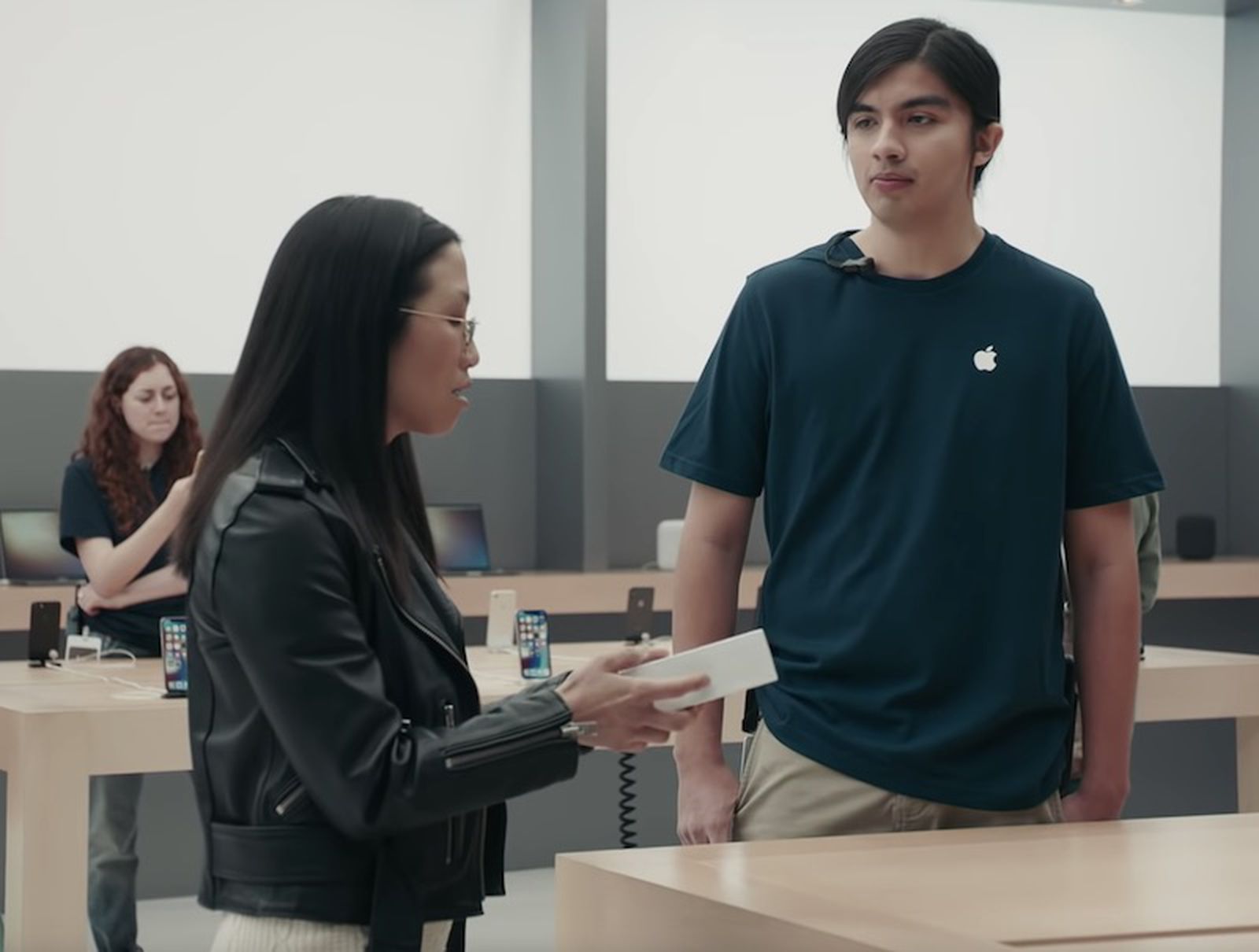 В первой рекламе клиент спрашивает, может ли он использовать свои проводные наушники с iPhone X, и «гений» сообщает ему, что ему понадобится переходник. Затем клиент спрашивает о зарядке одновременно, и «гений» говорит, что ему понадобится еще один переходник. Клиент тогда говорит: «Значит, двойной переходник».