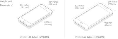 iPhone 6 имеет длину 5,44 дюйма и ширину 2,64 дюйма, а вес составляет 4,55 унции. iPhone 6 Plus имеет длину 6,22 дюйма и ширину 3,06 дюйма, весом 6,07 унции. Для сравнения, iPhone 5s имеет длину 4,87 дюйма, ширину 2,31 дюйма и весит 3,95 унции.