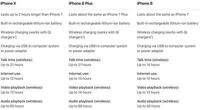 Благодаря улучшениям энергоэффективности, реализованным чипом A11 Bionic, iPhone X обеспечивает на два часа больше времени автономной работы, чем iPhone 7, но время работы уступает iPhone 7 Plus.