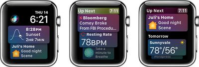 Предсказанные быстрые команды появляются прямо на циферблате Siri, позволяя выполнять такие задачи, как включение определенной сцены HomeKit, заказ кофе в любимом приложении, запись приема пищи во время ужина или начало прогулки.